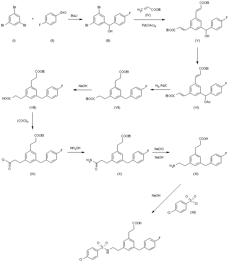 The reaction of 1,3,5-tribromobenzene (I) with 4-fluorobenzaldehyde (II) by means of BuLi in ethyl ether gives the benzhydrol (III), which is condensed with ethyl acrylate (IV) by means of palladium acetate and tri o-tolylphosphine in refluxing acetonitrile yielding the phenylenebisacrylate (V). The acetylation of (V) with acetic anhydride and DMAP in dichloromethane affords the acetate (VI), which is hydrogenated with H2 over Pd/C in ethyl acetate providing the bispropanoate (VII). Selective hydrolysis of (VII) with NaOH in ethanol gives the monoacid (VIII), which is treated with oxalyl chloride in dichloromethane yielding the monoacyl chloride (IX). The reaction of (IX) with NH4OH affords the corresponding amide (X), which is treated with NaOCl and NaOH to perform degradation of the amide group and simultaneous hydrolysis of the ester group providing the amino acid (XI). Finally, this compound is sulfonated with 4-chlorophenylsulfonyl chloride (XII) and NaOH.