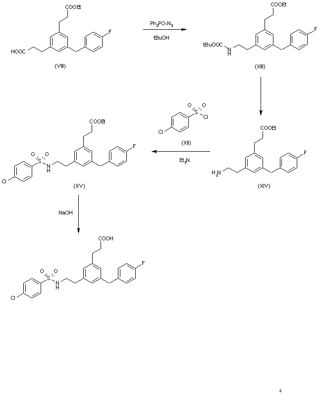 The reaction of monoacid (VIII) with diphenylphosphoryl azide and triethylamine in refluxing tert-butanol gives the tert-butoxycarbonyl aminoester (XIII), which is deprotected with trifluoroacetic acid to yield the aminoester (XIV). The sulfonation of (XIV) with 4-chlorophenylsulfonyl chloride (XII) and triethylamine in dichloromethane affords the sulfonamido ester (XV), which is finally hydrolyzed with NaOH in refluxing methanol.