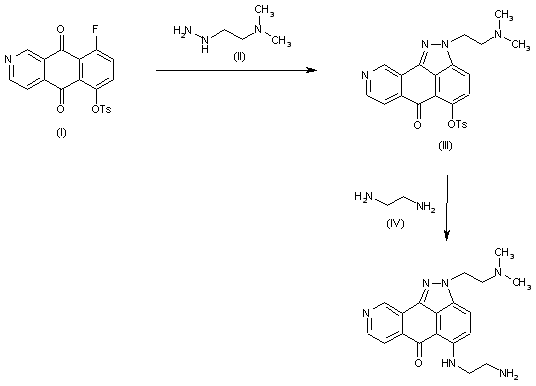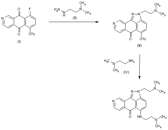 The cyclization of 9-fluoro-6-(tosyloxy)-5,10-dihydrobenzo[g]isoquinoline-5,10-dione (I) with 2-(dimethylamino)ethylhydrazine (II) gives 2-[2-(dimethylamino)ethyl]-5-(tosyloxy)indazolo[4,3-gh]isoquinolin-6(2H)-one (III), which is finally condensed with N,N-dimethylethylene-1,2-diamine (IV) to afford the title compound.