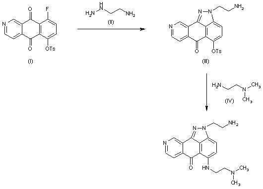 The cyclization of 9-fluoro-6-(tosyloxy)-5,10-dihydrobenzo[g]isoquinoline-5,10-dione (I) with 2-(dimethylamino)ethylhydrazine (II) gives 2-[2-(dimethylamino)ethyl]-5-(tosyloxy)indazolo[4,3-gh]isoquinolin-6(2H)-one (III), which is finally condensed with ethylene-1,2-diamine (IV) to afford the title compound.