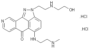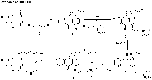 The synthesis of BBR-3438 has been described: The cyclization of 6-chloro-9-fluorobenz[g]isoquinoline-5,10-quinone (I) with 2-hydroxyethylhydrazine (II) in hot pyridine gives 2-(2-hydroxyethyl)-5-chloroindazolo[4,3-gh]isoquinolin-6(2H)-one (III), which is condensed with N-(2-aminoethyl)-N-methylcarbamic acid tert-butyl ester (IV) in hot pyridine yielding the corresponding 5-[2-[N-(tert-butoxycarbonyl)-N-methylamino]ethylamino] derivative (V). The mesylation of the OH group of (V) with mesyl chloride and triethylamine in dichloromethane affords the mesylate (VI), which is condensed with hot ethanolamine (VII) to give the protected compound (VIII). Finally, this compound is deprotected with HCl yielding BBR-3438.