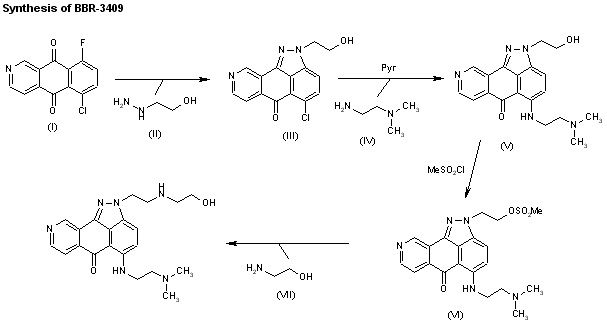 The synthesis of BBR-3409 has been described: The cyclization of 6-chloro-9-fluorobenz[g]isoquinoline-5,10-quinone (I) with 2-hydroxyethylhydrazine (II) in hot pyridine gives 2-(2-hydroxyethyl)-5-chloroindazolo[4,3-gh]isoquinolin-6(2H)-one (III), which is condensed with N-(2-aminoethyl)-N,N-dimethylamine (IV) in hot pyridine yielding the corresponding compound (V). The mesylation of the OH group of (V) with mesyl chloride and triethylamine in dichloromethane affords the mesylate (VI), which is condensed with hot ethanolamine (VII) to give BBR-3409.