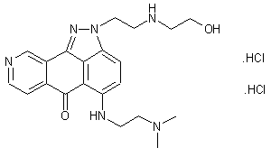 The synthesis of BBR-3438 has been described: The cyclization of 6-chloro-9-fluorobenz[g]isoquinoline-5,10-quinone (I) with 2-hydroxyethylhydrazine (II) in hot pyridine gives 2-(2-hydroxyethyl)-5-chloroindazolo[4,3-gh]isoquinolin-6(2H)-one (III), which is condensed with N-(2-aminoethyl)-N-methylcarbamic acid tert-butyl ester (IV) in hot pyridine yielding the corresponding 5-[2-[N-(tert-butoxycarbonyl)-N-methylamino]ethylamino] derivative (V). The mesylation of the OH group of (V) with mesyl chloride and triethylamine in dichloromethane affords the mesylate (VI), which is condensed with hot ethanolamine (VII) to give the protected compound (VIII). Finally, this compound is deprotected with HCl yielding BBR-3438.