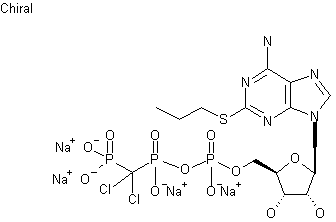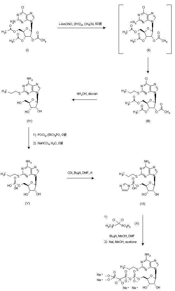 Diazotization of (I) with isoamyl nitrite in the presence of dipropyl disulfide afforded sulfide (III) through the intermediate diazonium salt (II). Further substitution of the chloro atom of (III) for ammonia provided 2-(propylthio)adenosine (IV). The 5'-hydroxyl group of (IV) was then phosphorylated by reaction with phosphoryl chloride in cold triethyl phosphate followed by aqueous work-up. The resulting 5'-monophosphate (V) was treated with carbonyl diimidazole and tri-n-butylamine to produce the phosphoryl imidazole intermediate (VI), which was finally condensed with dichloromethylenebis(phosphonic acid) (X). The target compound was isolated as the tetrasodium salt upon treatment with NaI in methanol-acetone.