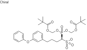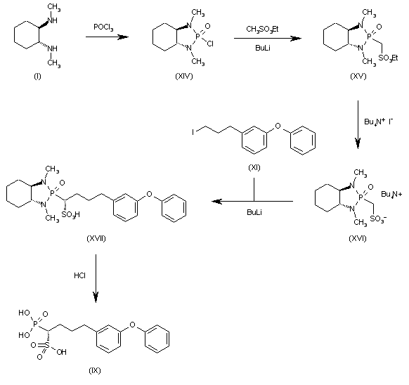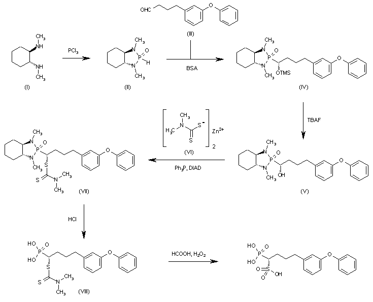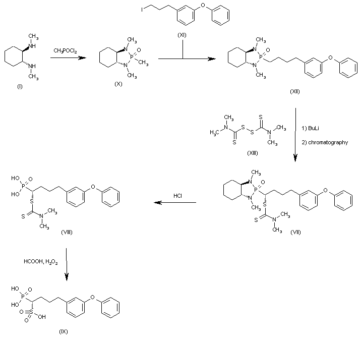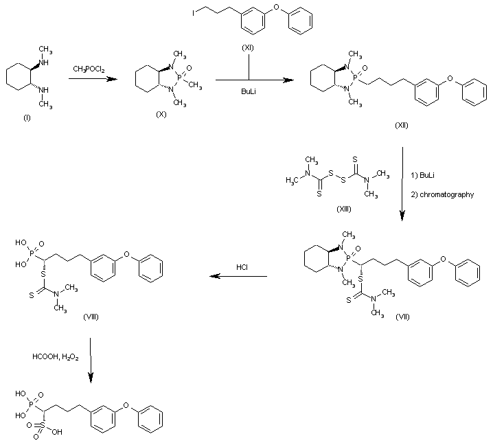 The cyclization of (R,R)-N,N'-dimethylcyclohexane-1,2-diamine (I) with PCl3 by means of triethylamine in THF gives the octahydro-1,3,2-benzodiazaphosphole (II), which is condensed with 4-(3-phenoxyphenyl)butanal (III) by means of bis(trimethylsilyl)acetamide (BSA) in dichloromethane yielding the silylated butanol (IV) as a mixture of diastereomers that is separated by flash chromatography. The deprotection of the desired isomer (IV) with TBAF in THF affords the free butanol (V), which is esterified with zinc N,N-dimethyldithiocarbamate (VI) by means of Ph3P and diisopropyl azodicarboxylate (DIAD) in THF giving the dithiocarbamic ester (VII). The hydrolysis of (VII) with HCl in acetonitrile yields the free phosphonic acid (VIII), which is oxidized with HCOOH and H2O2 in acetic acid affording the intermediate sulfonic acid (IX).