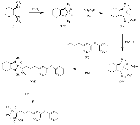 The cyclization of (R,R)-N,N'-dimethylcyclohexane-1,2-diamine (I) with POCl3 by means of triethylamine in THF gives the 2-chlorooctahydro-1,3,2-benzodiazaphophole (XIV), which is condensed with ethyl methanesulfonate by means of BuLi in THF yielding the substituted methanesulfonate (XV). The hydrolysis of (XV) with tetrabutylammonium iodide in THF affords the corresponding tetrabutylammonium sulfonate (XVI), which is then condensed with 3-(3-phenoxyphenyl) propyl iodide (XI) by means of BuLi in THF giving the precursor sulfonic acid (XVII). Finally, this compound is hydrolyzed to the target compound with HCl.