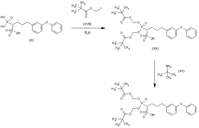 Finally, the target compound has been obtained as follows: The selective esterification of the phosphono group of intermediate (IX) with iodomethyl pivalate (XVIII) by means of triethylamine in DMF gives the sulfonic acid (XIX), which was purified through its calcium salt. Finally, this compound is treated with tert-butylamine in methanol to afford the target salt.