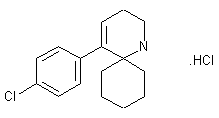 | 合成路线图解说明: Fischer esterification of 1-aminocyclohexanecarboxylic acid (I) provided the ethyl ester (II), which was alkylated with ethyl 4-bromobutyrate (III) in the presence of K2CO3 at 100 C to give aminodiester (IV). Dieckmann cyclization of (IV) using NaOEt afforded the azaspiro ketoester (V), which was decarboxylated under acidic conditions to yield ketone (VI). Addition of 4-chlorophenylmagnesium bromide (VII) to (VI) produced the tertiary acohol (VIII). This was dehydrated with concentrated H2SO4 to give the corresponding olefin as the sulfate salt, which was further treated with NaOH and then with HCl to furnish the corresponding hydrochloride. |