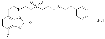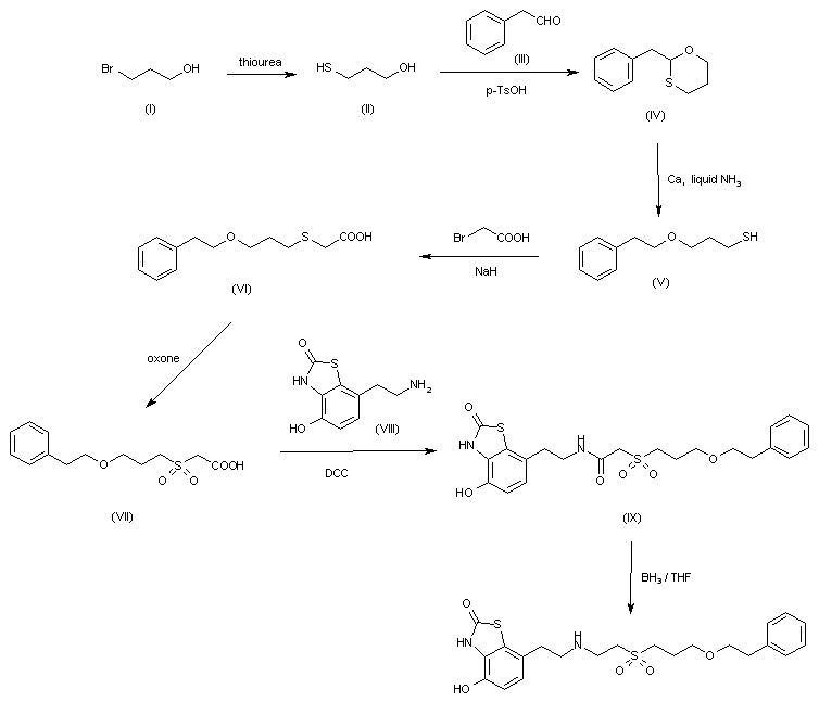 The reaction of 3-bromopropanol (I) with thiourea in refluxing water gives 3-sulfanylpropanol (II), which is cyclized with 2-phenylacetaldehyde (III) by means of p-toluenesulfonic acid in refluxing toluene yielding 2-benzyl-1,3-oxathiane (IV). The reductive cleavage of (IV) with Ca in liquid ammonia affords 3-(2-phenylethoxy)propanethiol (V), which is condensed with bromoacetic acid by means of NaH in DMF providing 2-[3-(2-phenylethoxy)propylsulfanyl]acetic acid (VI). The oxidation of (VI) with potassium peroxymonosulfate (oxone) gives the corresponding sulfonylacetic acid (VII), which is condensed with benzothiazolone (VIII) by means of DCC, HOBT and triethylamine in DMF yielding the correponding amide (IX). Finally, this compound is reduced with borane/THF yielding the target compound.