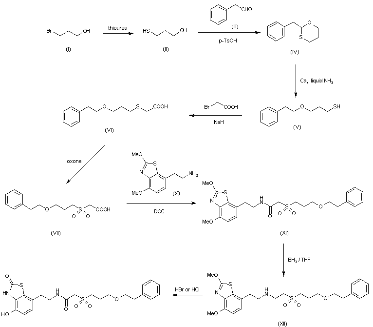 The reaction of 3-bromopropanol (I) with thiourea in refluxing water gives 3-sulfanylpropanol (II), which is cyclized with 2-phenylacetaldehyde (III) by means of p-toluenesulfonic acid in refluxing toluene yielding 2-benzyl-1,3-oxathiane (IV). The reductive cleavage of (IV) with Ca in liquid ammonia affords 3-(2-phenylethoxy)propanethiol (V), which is condensed with bromoacetic acid by means of NaH in DMF providing 2-[3-(2-phenylethoxy)propylsulfanyl]acetic acid (VI). The oxidation of (VI) with potassium peroxymonosulfate (oxone) gives the corresponding sulfonylacetic acid (VII).The condensation of sulfonylacetic acid (VII) with dimethoxybenzothiazole derivative (X) by means of DCC, HOBT and triethylamine in DMF gives the corresponding amide (XI), which is reduced with borane/THF yielding intermediate (XII). Finally, this compound is demethylated with concentrated HBr or HCl.