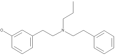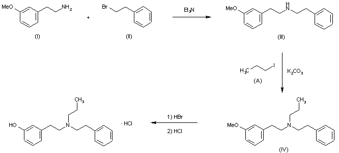 The reaction of 3-methoxyphenylethylamine (I) with phenylethyl bromide (II) in refluxing triethylamine gives 3-methoxy-N-(phenylethyl)phenylethylamine (III), which is alkylated with 1-iodopropane by means of K2CO3 in refluxing acetone yielding 3-methoxy-N-propyl-N-(phenylethyl)phenylethylamine (IV). Finally, this compound is demethylated by treatment with refluxing aqueous 48% HBr and formation of the HCl salt with hydrochloric acid.