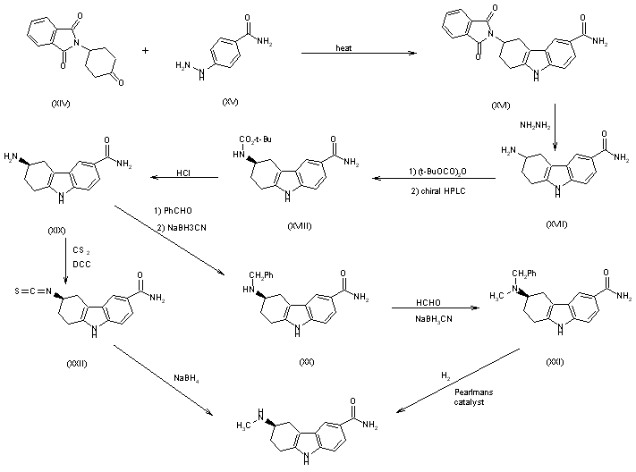 5) The cyclization of 4-phthalimidocyclohexanone (XIV) with 4-hydrazinobenzamide (XV) in relfuxing acetic acid gives 3-phthalimido-1,2,3,4-tetrahydro-9H-carbazole-6-carboxamide (XVI), which is treated with hydrazine in methanol yielding 3-amino-1,2,3,4-tetrahydro-9H-carbazole-6-carboxamide (XVII) as a racemic mixture. Reaction of (XVII) with di-tert-butyl dicarbonate gives the corresponding carbamate that is resolved by chiral HPLC in hexane/ethanol to give (XVIII). The hydrolysis of (XVIII) with HCl in dioxane affords the enantiomerically pure (R)-amine (XIX) (1-3). The reductoalkylation of (XIX) with benzaldehyde and NaBH3CN yields the corresponding benzylamine (XX), which is methylated with formaldehyde and NaBH3CN to the N-benzyl-N-methylamine (XXI). Finally, this compound is debenzylated by hydrogenation as usual. 6) The monomethylation of (XIX) can also be performed by its reaction with carbon disulfide and dicyclohexylcarbodiimide (DCC) in pyridine to give the expected isothiocyanato (XXII), which is finally reduced with NaBH4 in ethanol.