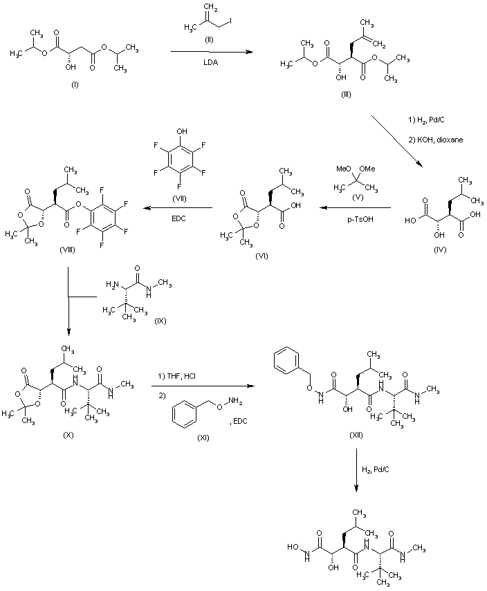 Treatment of butanedioate derivative (I) with methallyl iodide (II) and LDA in THF affords alkene (III), which is then reduced by hydrogenation over Pd/C and subjected to saponification by means of KOH in dioxane to yield succinic acid (IV). Protection of (IV) with 2,2-dimethoxypropane (V) and p-TsOH in DMF provides derivative (VI), which is then coupled with pentafluorophenol (VII) by using EDC in CH2Cl2 to furnish activated ester (VIII). Displacement of the pentafluorophenol moiety of (VIII) by treatment with L-tert-leucine methylamide (IX) in DMF gives methylamide derivative (X), which is deprotected with THF and HCl and condensed with O-benzylhydroxylamine (XI) by means of EDC to afford derivative (XII). Finally, (XII) is debenzylated by hydrogenation over Pd/C in EtOH to give the target compound.