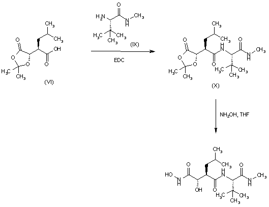 An improved method for the obtaining of the desired product is the direct coupling of carboxylic acid derivative (VI) with L-tert-leucine methylamide (IX) by using EDC in CH2Cl2 to furnish methylamide derivative (X), followed by final treatment of (X) with hydroxylamine (NH2OH) in THF.