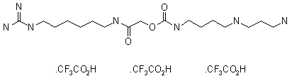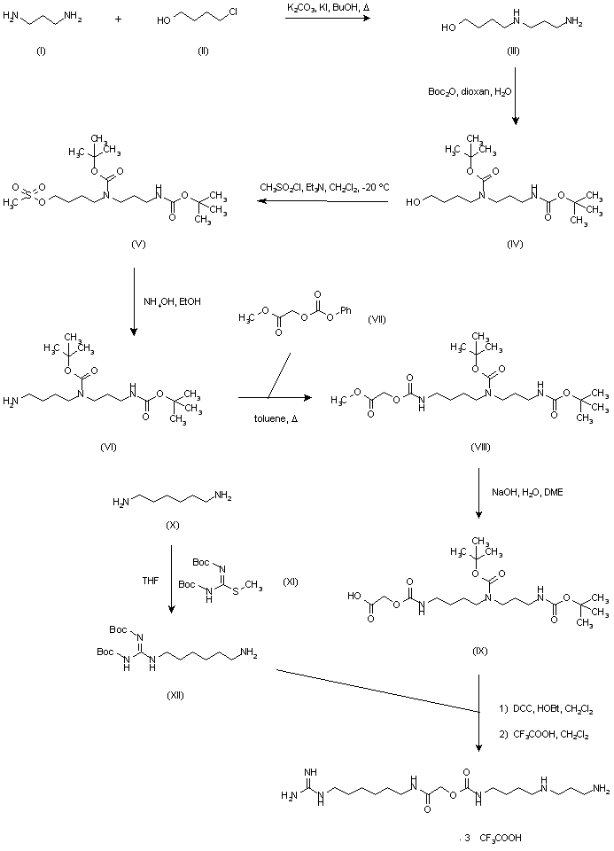 Monoalkylation of 1,3-propanediamine (I) with 4-chlorobutanol (II) in refluxing n-BuOH afforded diaminoalcohol (III), which was protected as the bis-carbamate (IV) upon treatment with Boc2O. Subsequent reaction of (IV) with methanesulfonyl chloride and Et3N provided mesylate (V), and this was further treated with ethanolic ammonia to yield primary amine (VI). Condensation of amine (VI) with (methoxycarbonylmethyl) phenyl carbonate (VII) in refluxing toluene gave carbamate (VIII). Saponification of the methyl ester function of (VIII) then furnished carboxylic acid (IX). 1,6-Hexanediamine (X) was condensed with N,N'-bis(tert-butoxycarbonyl)-S-methylisothiourea (XI) to produce the (6-aminohexyl)guanidine derivative (XII). This was then coupled with carboxylic acid (IX) using DCC and HOBt. Finally, the N-Boc groups were deprotected with trifluoroacetic acid in CH2Cl2.