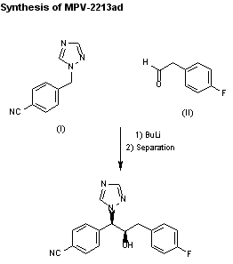 MPV-2213ad was synthesized by condensation of 4-(1,2,4-triazol-1-ylmethyl)benzonitrile (I) with 2-(4-fluorophenyl)acetaldehyde (II) by means of butyllithium in THF. The two diastereomeric racemates are separated by flash chromatography.