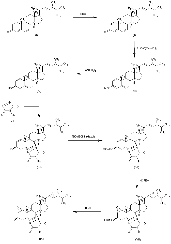 The reaction of ergosta-4,6,22-trien-3-one (I) with DDQ and 5-sulfosalicylic acid in refluxing dioxane gives ergosta-1,4,6,22-tetraen-3-one (II), which is acylated with isopropenyl acetate and Ts-OH in refluxing butyl acetate yielding 3-acetoxyergosta-1,3,5,7,22-pentaene (III). The reduction of (III) with calcium borohydridde in ethanol affords ergosta-1,5,7,22-tetraen-3beta-ol (IV), which is condensed with 4-phenyl-3H-4,5-dihydro-1,2,4-triazole-3,5-dione (V) in ethyl acetate yielding the Diels-Alder adduct (VI). The silylation of (VI) with TBDMS-Cl and imidazole affords the silyl ether (VII), which is epoxidized with MCPBA in chloroform giving the 1alpha,2alpha-22,23-diepoxide (VIII). The elimination of the silyl group with TBAF in THF gives the 3beta-alcohol (IX).