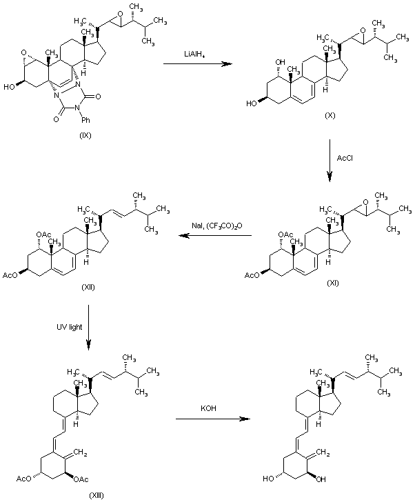 The reduction of (IX) with LiAlH4 in refluxing THF eliminates the Diels-Alder adduct and opens the 1alpha,2alpha-epoxide giving the 1alpha,2beta-diol (X), which is acylated with acetyl chloride in pyridine yielding the diacetoxy epoxide (XI). The reaction of (XI) with NaI and trifluoroacetic anhydride in acetonitrile/THF regenerates the 22,23-double bond affording 1alpha-acetoxyergosteryl acetate (XII), which is submitted to UV irradiation with a high pressure mercury lamp in ethyl ether to provide the diacetate of 1alpha-hydroxyvitamin D2 (XIII). Finally, this compound is deacylated with KOH in refluxing ethanol.