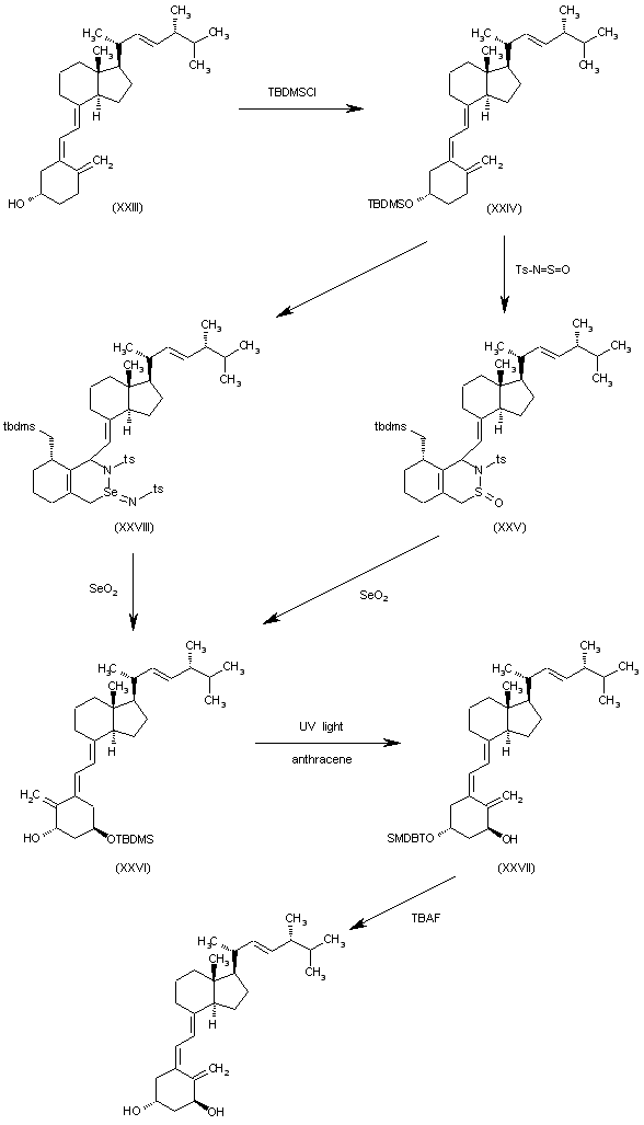 The silylation of vitamin D2 (XXIII) with TBDMS-Cl and imidazole in dichloromethane gives the silyl ether (XXIV), which is cyclized with N-sulfinyl-p-toluenesulfonamide yielding the Diels-Alder adduct (XXV). The oxidation of (XXV) with SeO2 and N-methylmorpholine-oxide in ethanol affords the trans-1alpha-hydroxy-3-O-(tert-butyldimethylsilyl)vitamin D2 (XXVI), which is irradiated with UV light in benzene containing anthracene yielding 1alpha-hydroxy-3-O-(tert-butyldimethylsilyl)vitamin D2 (XXVII). Finally, this compound is desilylated with TBAF in THF. The cyclization of the silyl ether (XXIV) can also be performed with Ts-N=Se=N-Ts yielding the corresponding adduct (XXVIII), which is oxidized with SeO2 as before to afford the trans-1alpha-hydroxy-3-O-(tert-butyldimethylsilyl) vitamin D2 (XXVI) already reported.
