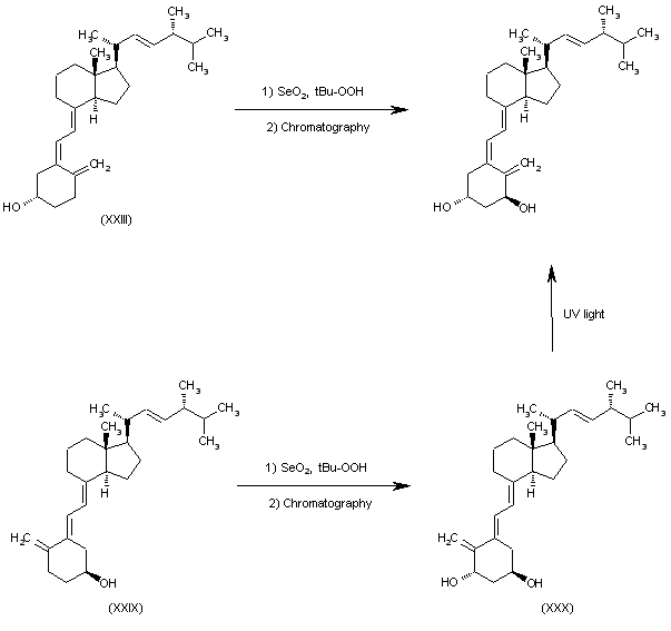 By allylic oxidation of vitamin D2 (XXIII) with SeO2 and tert-butyl hydroperoxide in pyridine followed by purification by TLC over silicagel. The allylic oxidation of trans-vitamin D2 (XXIX) with SeO2, tert-butyl hydroperoxide and octahydroacridine in dichloromethane gives the trans-1alpha-hydroxyvitamin D2 (XXX), which is isomerized to the target compound by irradiation with UV light with anthracene as photosensitizer.