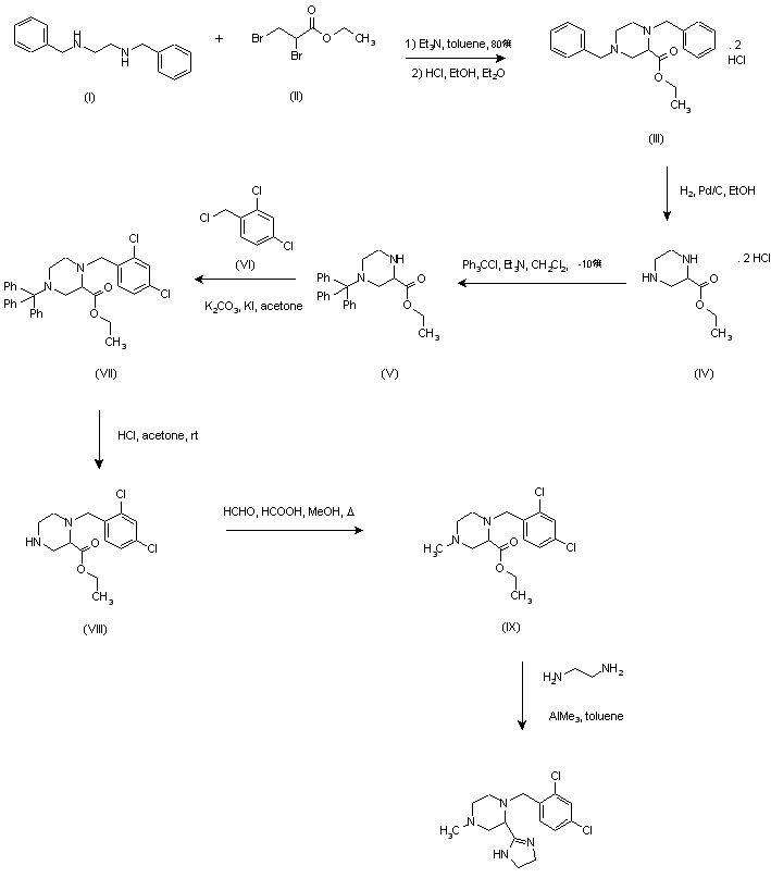 Condensation of N,N'-dibenzylethylenediamine (I) with ethyl 2,3-dibromopropionate (II) in the presence of Et3N in toluene at 80 C gave, after acidification, piperazine (III). Then, hydrogenolytic N-debenzylation in the presence of Pd/C provided ethyl piperazine-2-carboxylate (IV), which was selectively alkylated at position 4 with 1 equivalent of triphenylmethyl chloride in the presence of Et3N at -10 C to give (V). Subsequent alkylation with 2,4-dichlorobenzyl chloride (VI) in the presence of K2CO3 and a catalytic amount of KI provided (VII). Removal of the N-trityl group by treatment with HCl in either acetone or ethanol afforded piperarine (VIII), which was N-methylated by reaction with formaldehyde and formic acid in refluxing MeOH. Finally, the resulting compound (IX) was converted into the imidazoline on treatment with ethylenediamine and trimethylaluminum in refluxing toluene.