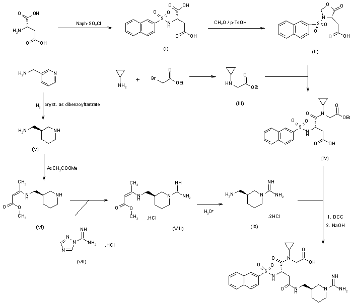 A general synthesis of this entire class of thrombin inhibitors has been published recently. An alternative synthesis for the preparation of napsagatran is outlined in Scheme 21319301a: L-Aspartic acid is sulfonated with naphthalenesulfochloride to give the sulfonamide (I). Reaction of (I) with formaldehyde leads to the oxazolinone (II), which is reacted with N-cyclopropylglycine ethyl ester (III) to afford the aspartate (IV). Condensation of (IV) with the guanidine (IX) and saponification of the ethyl ester group provides napsagatran. For the preparation of the guanidine (IX), picolylamine is hydrogenated to give the racemic 3-aminomethyl-piperidine, from which the desired enantiomer (V) is isolated as dibenzoyltartrate by crystallization. Reaction of piperidine (V) with acetoacetate affords the protected piperidine (VI), which is amidinated with amidinotriazole (VII) to give the protected guanidine (VIII). Deprotection of (VIII) with hydrochloric acid provides the enantiomerically pure guanidine (IX) as dihydrochloride.