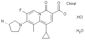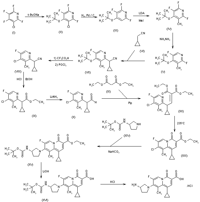 The reaction of 3-chlorotetrafluoropyridine (I) with sodium tert-butoxide in THF gives 4-tert-butoxy-3-chloro-2,5,6-trifluoropyridine (II), which is dechlorinated with H2 over Pd/C in methanol yielding 4-tert-butoxy-2,3,6-trifluoropyridine (III). The methylation of (III) with methyl iodide and lithium diethylamide (LDA) in THF affords 4-tert-butoxy-2,3,6-trifluoro-5-methylpyridine (IV), which is selectively defluorinated with hydrazine in refluxing propanol to give 4-tert-butoxy-2,5-difluoro-3-methylpyridine (V). The condensation of (V) with cyclopropylacetonitrile (VI) by means of LDA in THF yields 2-(4-tert-butoxy-5-fluoro-3-methyl-2-pyridyl)-2-cyclopropylacetonitrile (VII), which is treated first with trifluoroacetic acid and then with POCl3 to afford 2-(4-chloro-5-fluoro-3-methyl-2-pyridyl)-2-cyclopropylacetonitrile (VIII). The alcoholysis of (VIII) with ethanol/HCl gives the corresponding ethyl ester (IX), which is partially reduced with LiAlH4 in THF to afford the corresponding aldehyde (X). The condensation of (X) with diethyl malonate (XI) by means of piperidine in refluxing ethanol yields the ethylidenemalonate (XII), which, without isolation, is cyclized by heating at 235 C in Dowtherm to afford 8-chloro-1-cyclopropyl-7-fluoro-9-methyl-4-oxo-4H-quinolizine-3-carboxylic acid ethyl ester (XIII). The reaction of (XIII) with 3(S)-(tert-butoxycarbonylamino)pyrrolidine (XIV) by means of NaHCO3 in acetonitrile gives the corresponding condensation product (XV), which is hydrolyzed ith LiOH in THF/water to the corresponding free acid (XVI). Finally, this compound is deprotected with 4N HCl in dioxandichloromethane.