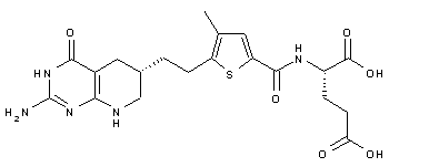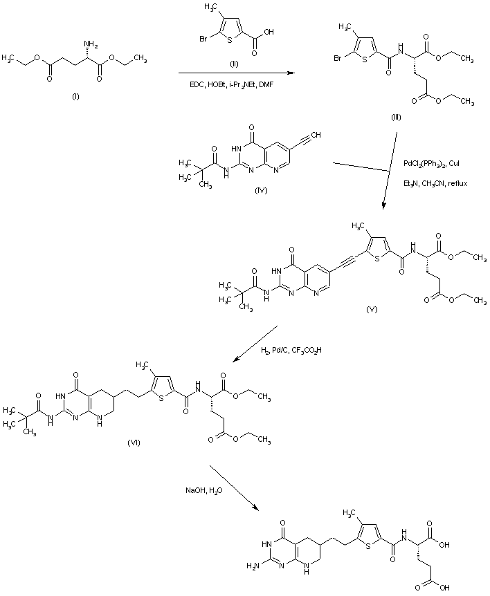 Acylation of diethyl L-glutamate (I) with 5-bromo-4-methylthiophene-2-carboxylic acid (II) using EDC as the coupling reagent provided amide (III). Subsequent palladium-catalyzed coupling between bromothiophene (III) and ethynyl pyridopyrimidinone (IV) furnished the disubstituted acetylene (V), which was further hydrogenated to (VI) in the presence of Pd/C in trifluoroacetic acid. Finally, basic hydrolysis of the ethyl ester and pivaloyl groups of (VI) led to the title compound.