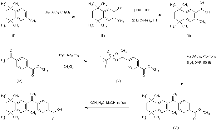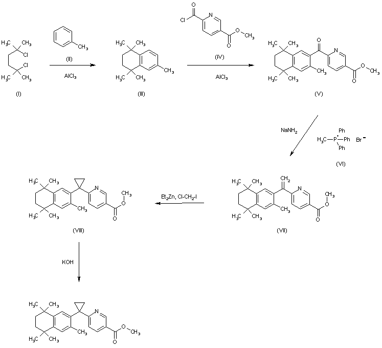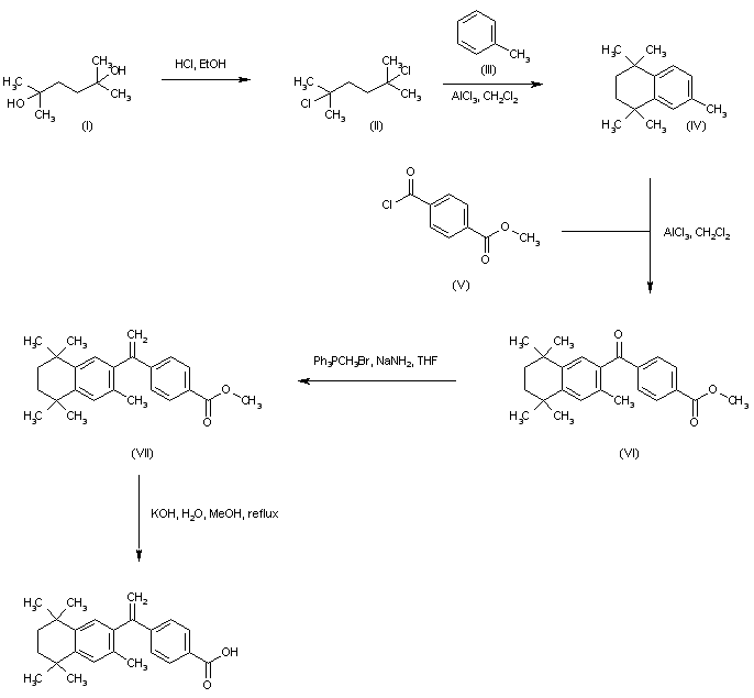 Treatment of 2,5-dimethyl-2-5-hexanediol (I) with dry hydrogen chloride in EtOH gives rise to the dichloro compound (II). Subsequent Friedel-Crafts condensation of dichloride (II) with toluene (III) in the presence of AlCl3 affords the tetrahydronaphthalene derivative (IV) (1). This is then condensed with mono-methyl terephthalic acid chloride (V) to produce ketone (VI). Wittig reaction of (VI) with methylene triphenylphosphorane leads to olefin (VII). Finally, alkaline hydrolysis of the methyl ester group of (VII) furnishes the target carboxylic acid