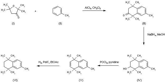 The intermediate tetrahydronaththalene (VI) has been prepared by an alternative procedure. Friedel-Crafts condensation of dihydro-2,2,5,5-tetramethyl-3(2H)-furanone (I) with toluene (II) by means of AlCl3 produces tetrahydronaphthalenone (III). This is reduced to alcohol (IV) employing NaBH4 in MeOH. Subsequent dehydration of (IV) with POCl3 in pyridine leads to the dihydronaphthalene (V). Then, catalytic hydrogenation of (V) over Pd/C provides the key pentamethyltetrahydronaphthalene (VI)