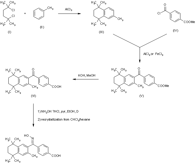 Friedel-Crafts condensation of 2,5-dichloro-2,5-dimethylhexane (I) with toluene (II) in the presence of AlCl3 or FeCl3 afforded the tetrahydronaphthalene (III). Subsequent acylation of (III) with monomethyl terephthalic acid chloride (IV) provided keto ester (V), which was hydrolyzed to keto acid (VI) with methanolic KOH. Condensation of (VI) with hydroxylamine hydrochloride gave the corresponding oxime as a mixture of geometric isomers. The required Z isomer was then isolated by recrystallization from chloroform/hexane.