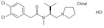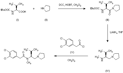 N-tert-Butoxycarbonyl valine (I) was converted to amide (III) by coupling with pyrrolidine (II) by means of DCC and HOBT. Simultaneous reduction of both carbamoyl and amide functions of (III) using excess LiAlH4 in THF gave the chiral diamine (IV). Final acylation of (IV) with (3,4-dichlorophenyl)acetyl chloride (V) in CH2Cl2 yielded the target amide.