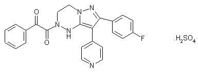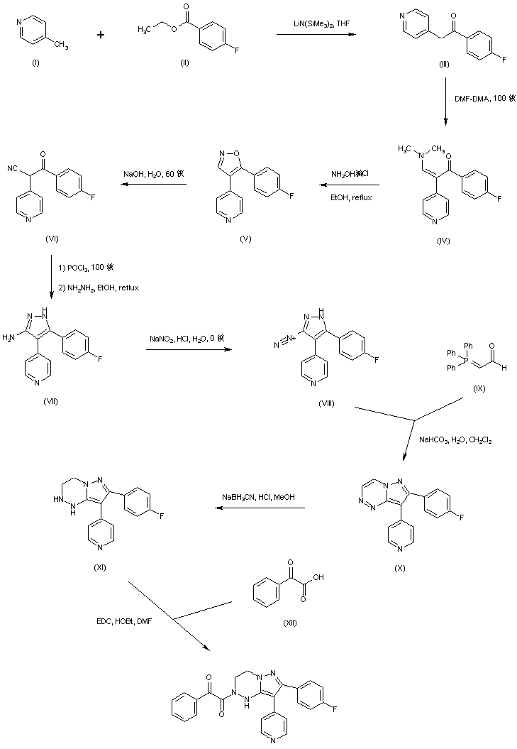 The lithium derivative of 4-picoline (I) was acylated with ethyl 4-fluorobenzoate (II) to afford ketone (III). Condensation of (III) with dimethylformamide dimethylacetal provided enaminone (IV) which was subsequently cyclized with hydroxylamine to give the diaryl isoxazole (V). Isoxazole ring opening in (V) under basic conditions led to keto nitrile (VI). Chlorination of (VI) by means of POCl3, followed by reaction with hydrazine, furnished the amino pyrazole (VII). The diazonium salt (VIII) prepared from amino pyrazole (VII) was then added to the phosphorane aldehyde (IX) to generate the pyrazolotriazine (X). Hydrogenation of the triazine ring of (X) employing NaBH3CN produced the tetrahydro pyrazolotriazine (XI). This was finally acylated by phenylglyoxylic acid (XII) to yield the target alpha-oxo amide.