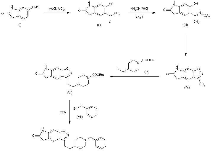 The Friedel Crafts condensation of 6-methoxyindolin-2-one (I) with acetyl chloride and AlCl3 gives the 5-acetyl-6-methoxyindolin-2-one (II), which is treated with hydroxylamine and acetic anhydride to yield the O-acetyloxime (III). The cyclization of (III) affords the 3-methyl-6,7-dihydro-5H-isoxazolo[4,5-f]indol-6-one (IV), which is condensed with 4-(iodomethyl)piperidine-1-carboxylic acid tert-butyl ester (V) to provide the adduct (VI). Finally this compound is deprotected with TFA and benzylated with benzyl bromide (VII) to furnish the target compound.