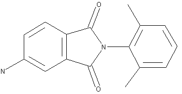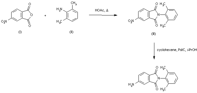 Phthalimide (III) was prepared by condensation of 4-nitrophthalic anhydride (I) with 2,6-dimethylaniline (II) in refluxing AcOH. Reduction of the nitro group of (II) by transfer hydrogenation using cyclohexene and Pd/C provided the title aminophthalimide.