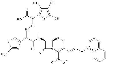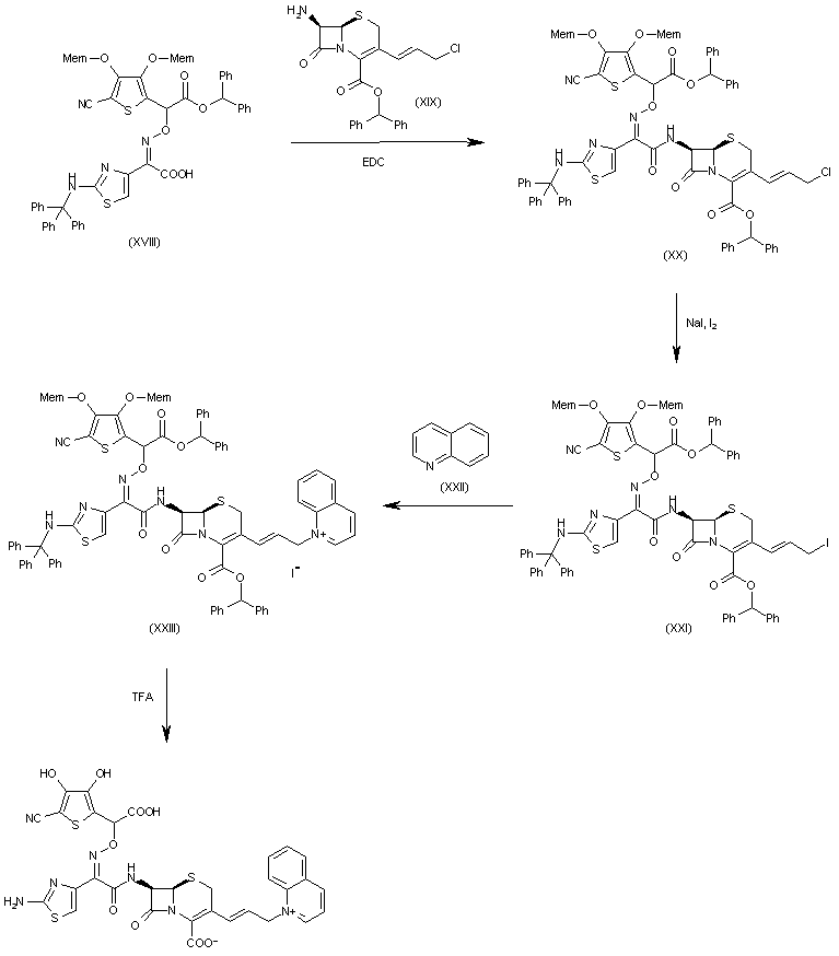 The condensation of (XVIII) with 7-beta-amino-3-(3-chloro-1(E)-propenyl)-3-cephem-4-carboxylic acid diphenylmethyl ester (XIX) affords the expected amide (XX). The halogen exchange in (XX) with I2 and NaI in acetone gives the 3-iodo-1(E)-propenyl derivative (XXI), which is treated with quinoline (XXII) in dichloromethane to provide the quinolinium salt (XXIII). Finally, this compound is fully deprotected by a treatment with TFA and anisole.