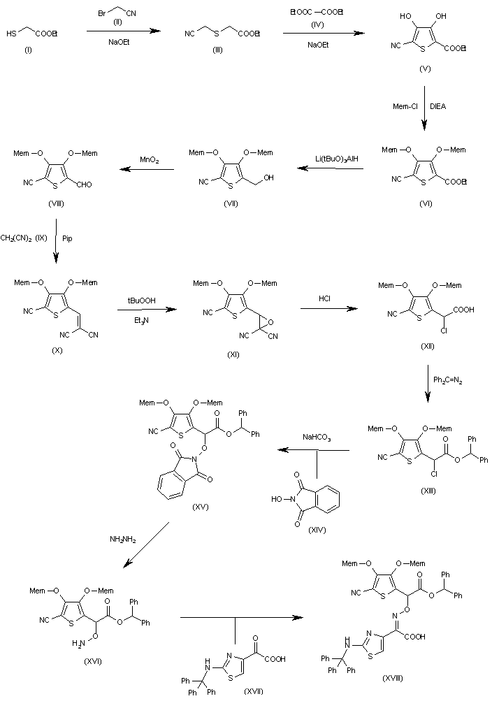 The reaction of ethyl 2-sulfanylacetate (I) with 2-bromoacetonitrile (II) by means of NaOEt in ethanol gives ethyl 2-(cyanomethylsulfanyl)acetate (III), which is cyclized with diethyl oxalate (IV) by means of NaOEt in ethanol yielding 5-cyano-3,4-dihydroxythiophene-2-carboxylic acid ethyl ester (V). The protection of the hydroxyl groups of (V) with 2-methoxyethoxymethyl chloride (Mem-Cl) and DIEA in dichloromethane affords the protected thiophene (VI), which is reduced with (t-BuO)2AlH in THF providing the carbinol (VII). The oxidation of (VII) with MnO2 in dichloromethane yields the carbaldehyde (VIII), which is condensed with malonodinitrile (IX) by means of piperidine in dioxane giving the alkylidenemalonodinitrile (X). The epoxidation of (X) with tert-butyl hydroperoxide and TEA in dioxane yields the epoxide (XI), which is treated with HCl in THF to afford 2-chloro-2-[5-cyano-3,4-bis(2-methoxyethoxymethoxy) thiophen-2-yl]acetic acid (XII). The esterification of (XII) with diphenyldiazomethane affords the corresponding diphenylmethyl ester (XIII), which is condensed with N-hydroxyphthalimide (XIV) and NaHCO3 in dichloromethane providing the adduct (XV). The cleavage of the phthalimido group of (XV) with hydrazine in methanol gives 2-(aminooxy)-2-[5-cyano-3,4-bis(2-methoxyethoxymethoxy)thiophen-2-yl]acetic acid diphenylmethyl ester (XVI), which is condensed with 2-oxo-2-[2-(tritylamino)thiazol-4-yl]acetic acid (XVII) yielding the corresponding alcoxyimino derivative (XVIII).
