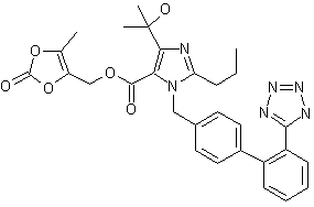 The cyclization of trimethyl orthobutyrate (I) with (Z)-2,3-diaminobutenedinitrile (II) gives 2-propylimidazole-4,5-dicarbonitrile (III), which is hydrolyzed with 6N HCl to the corresponding dicarboxylic acid (IV). The esterification of (IV) with ethanol/dry HCl yields the diethyl ester (V), which is treated with methylmagnesium iodide in ethyl ether/dichloromethane affording 4-(1-hydroxy-1-methylethyl)-2-propylimidazole-5-carboxylic acid ethyl ester (VI). The condensation of (VI) with 5-[4'-(bromomethyl)biphenyl-2-yl]-1-(triphenylmethyl)tetrazole (VII) by means of potassium tert-butoxide in dimethylacetamide (DMA) (1) or sodium hydride in DMF (2) gives 4-(1-hydroxy-1-methylethyl)-2-propyl-1-[2'-[1-(triphenylmethyl)-5-tetrazolyl]biphenyl-4-ylmethyl]imidazole-5-carboxylic acid ethyl ester (VIII), which is hydrolyzed with LiOH in dioxane/water to the corresponding free acid (IX). The esterification of (IX) with the chloromethyldioxole (X) by means of K2CO3 in DMA gives the desired ester (XI), which is finally deprotected with aqueous acetic acid.