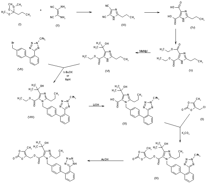 Condensation of diaminomaleonitrile (I) with trimethyl orthobutyrate (II) produced the imino ether (III), which was further cyclized to imidazole (IV) upon heating in xylene. Acid hydrolysis of the imidazole dinitrile (IV) led to diacid (V), and subsequent Fischer esterification with ethanolic HCl provided diester (VI). Regioselective addition of methylmagnesium bromide to diester (VI) furnished the imidazole carbinol (VII). Alkylation of imidazole (VII) with the biphenyl bromide (VIII) furnished the (biphenylylmethyl)imidazole (IX). Then, removal of the trityl protecting group of (IX) under acidic conditions, followed by alkaline ester hydrolysis gave rise to the title compound.