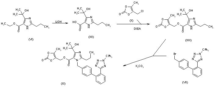 2) The hydrolysis of 4-(1-hydroxy-1-methylethyl)-2-propylimidazole-5-carboxylic acid ethyl ester (VI) with LiOH in water gives the corresponding free acid (XII), which is esterified with the chloromethyldioxole (X) by means of diisopropylethylamine (DIEA) yielding the expected ester (XIII). Finally, this compound is condensed with 5-[4-'(bromomethyl)biphenyl-2-yl]-1-(triphenylmethyl)tetrazole (VII) by means of potassium carbonate in DMA to afford the protected CS-866 (XI) already obtained.