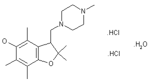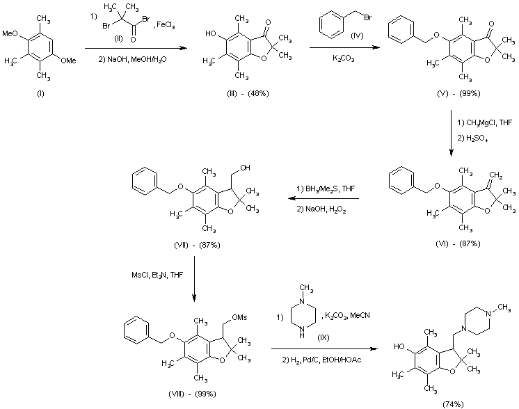 The cyclization of 2,5-dimethoxy-1,3,4-trimethylbenzene (I) with 2-bromo-2-methylpropionyl bromide (II) by means of FeCl3 and NaOH in methanol/water gives 5-hydroxy-2,2,4,6,7-pentamethyl-2,3-dihydrobenzofuran-3-one (III), which is treated with benzyl bromide (IV) and K2CO3 to yield the benzyl ether (V). The reaction of (V) with methylmagnesium bromide, followed by dehydration of the intermediate carbinol affords the methylene derivative (VI), which is hydroxylated with borane / dimethylsulfide and NaOH/H2O2 to furnish the hydroxymethyl compound (VII). The reaction of (VII) with MsCl and TEA gives the mesylate (VIII), which is finally condensed with 1-methylpiperazine (IX) by means of K2CO3 and debenzylated by hydrogenation with H2 over Pd/C in ethanol/HOAc to afford the target compound as a racemic mixture.
