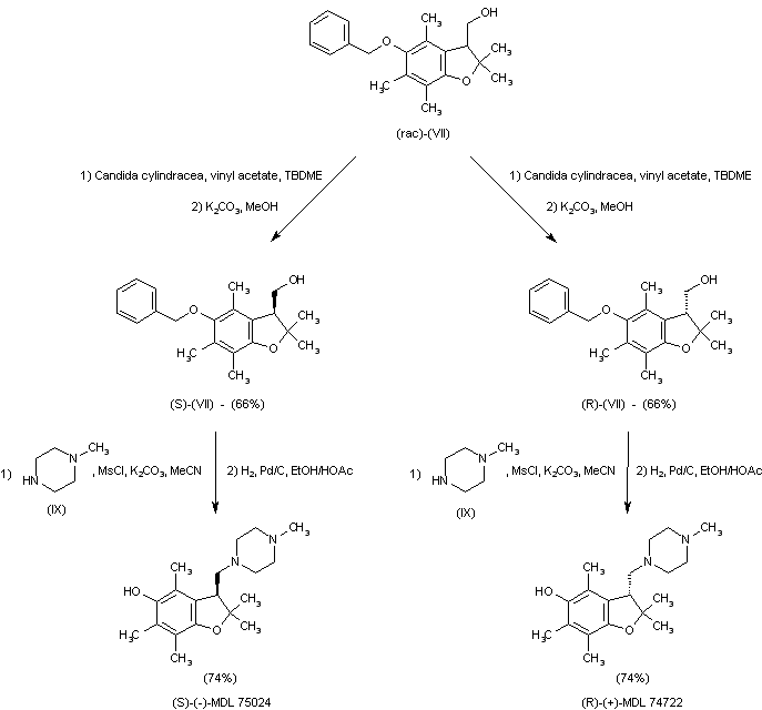 The enantiomers of the title product have been obtained by optical resolution of the racemic hydroxymethyl compound (rac)-(VII) by means of "Candida cylindracea" and vinyl acetate to give (S)-(VII) and (R)-(VII). Finally both chiral intermediates are condensed with 1-methylpiperazine (IX) and debenzylated by hydrogenation with H2 over Pd/C in ethanol/HOAc for the racemic mixture (rac)-(VII).