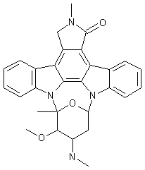 The known antibiotic staurosporine (I) was protected as the N-benzyloxycarbonyl derivative (II) by treatment with benzyl chloroformate in the presence of NaHCO3. Subsequent alkylation of (II) at the 2-N atom by treatment with iodomethane and NaH in DMF provided the N-methyl derivative (III). Finally, deprotection of the benzyloxycarbonyl group of (III) by hydrogenation over Pd/C furnished the title compound.