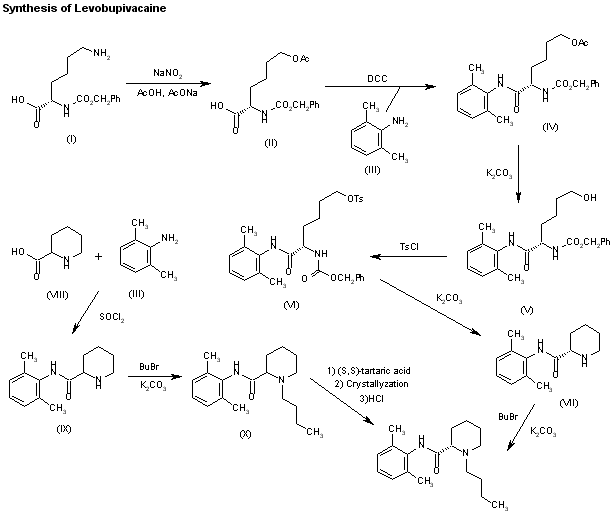 Levobupivacaine has been obtained by two different ways: 1) The deamination of N-benzoyloxycarbonyl-L-lysine (I) with NaNO2/acetic acid gives 6-acetoxy-2(S)-(benzyl-oxycarbonylamino)hexanoic acid (II), which is amidated with 2,6-dimethylaniline (III) and dicyclohexylcarbodiimide (DCC) to the expected amide (IV). The deacetylation of (IV) with K2CO3 in methanol affords compound (V), which is tosylated as usual with tosyl chloride giving intermediate (VI), which is stereospecifically cyclized by means of K2CO3 in ethanol yielding N-(2,6-dimethyl-phenyl)piperidine-2 (S)-carboxamide (VII). Finally, this compound is alkylated with butyl bromide and K2CO3 or by reductoalkylation with butyraldehyde. 2) The amidation of piperidine-2-carboxylic acid (VIII) with 2,6-dimethylaniline (III) by means of SOCl2 in toluene gives the corresponding amide (IX), which is alkylated with butyl bromide as before yielding racemic bupivacaine (X) (3). This compound is then submitted to optical resolution by treatment with (S,S)-(?-tartaric acid followed by crystallization of the resulting tartrate and acidification with HCl in isopropanol.