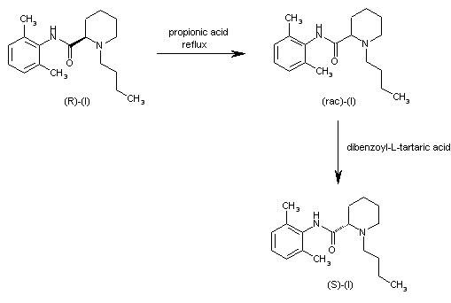 Improved yield in the synthesis of levobupivacaine. An improved yield in the synthesis of levobupivacaine can be obtained by recovering the unwanted (R)-enantiomer side product in the optical resolution of the racemic bupivacaine. The treatment of (R)-(I) with refluxing propionic acid causes its racemization, yielding racemic-(I) (bupivacaine), which is then submitted to a new optical resolution process using dibenzoyl-L-tartaric acid.