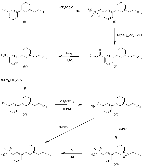 The reaction of 3-(1-propylpiperidin-3(S)-yl)phenol (I) with trifluoromethanesulfonic anhydride gives the triflate (II), which is treated with Pd(OAc)4, CO and MeOH, yielding 3-(1-propylpiperidin-3(S)-yl)benzoic acid methyl ester (III). The reaction of (III) with sodium azide and H2SO4 affords the aniline (IV), which by reaction with NaNO2, HBr and CuBr provides 3(S)-(3-bromophenyl)-1-propylpiperidine (V). The reaction of (V) with dimethyl disulfide and n-BuLi gives the thioether (VI), which is oxidized with MCPBA to afford the target sulfone, which is easily separated from the N-oxide (VII) also formed in the oxidation process. The N-oxide (VII) can be reduced to the target compound by means of TiCl4 and NaI in acetonitrile.