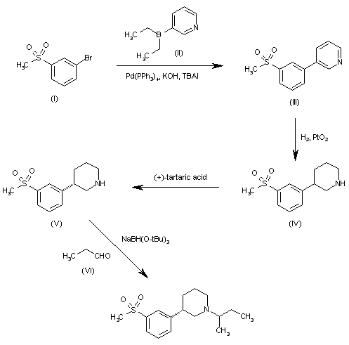 The condensation of 3-(methylsulfonyl)bromobenzene (I) with diethyl(3-pyridyl)borane (II) by means of Pd(PPh3)4, KOH and tetrabutylammonium iodide (TBAI) gives 3-[3-(methylsulfonyl)phenyl]pyridine (III), which is hydrogenated with H2 over PtO2 in methanol, yielding the racemic piperidine (IV). The optical resolution of (IV) with (+)-tartaric acid affords the (S)-enantiomer (V), which is alkylated by reductocondensation with propionic aldehyde and NaBH(O-tBu)3 in dichloroethane and HOAc.
