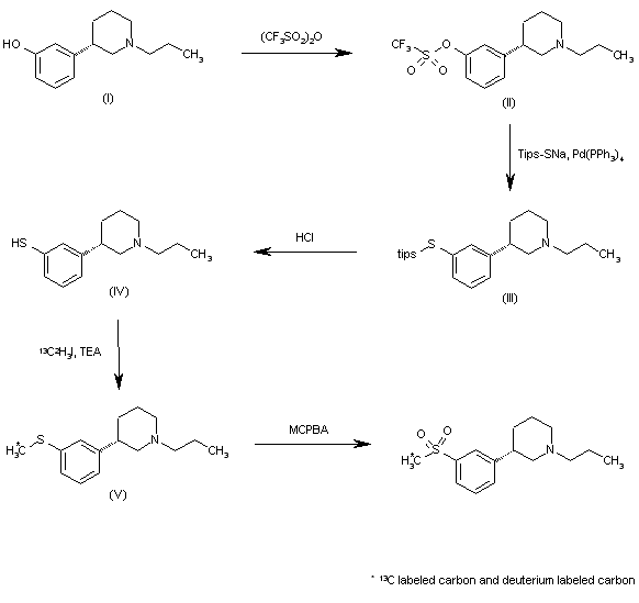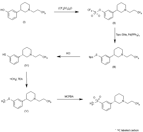 The reaction of 3-(1-propylpiperidin-3(S)-yl)phenol (I) with trifluoromethanesulfonic anhydride gives the triflate (II), which is treated with triisopropylsilylthiol sodium salt and Pd(PPh3)4 to yield the sill sulfanyl compound (III). The desilylation of (III) with HCl in methanol affords the thiophenol (IV), which is methylated with 14C-labeled methyl iodide and TEA in dichloromethane, providing the methylsulfanyl derivative (V). Finally, this compound is oxidized to the target sulfone with MCPBA and trifluoroacetic acid.