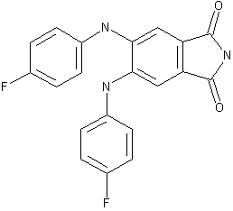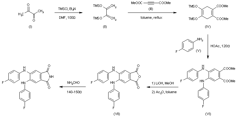 The silylation of butane-2,3-dione(I) with TMSCl and TEA in hot DMF gives the silylated enol (II), which is cyclized with dimethyl acetylenedicarboxylate (III) in refluxing toluene to yield 4,5-bis(trimethylsilyloxy)-3,6-dihydrophthalic acid dimethyl ester (IV). The condensation of (IV) with 4-fluoroaniline (V), with simultaneous aromatization in refluxing acetic acid affords 4,5-bis(4-fluorophenylamino)phthalic acid dimethyl ester (VI), which is hydrolyzed with LiOH in methanol and anhydrized with acetic anhydride in toluene giving the corresponding phthalic anhydride (VII). Finally this compound is treated with ammonium formate at 140-50 C to furnish the target phthalimide.