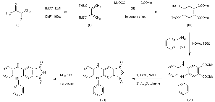 The silylation of butane-2,3-dione(I) with TMSCl and TEA in hot DMF gives the silylated enol (II), which is cyclized with dimethyl acetylenedicarboxylate (III) in refluxing toluene to yield 4,5-bis(trimethylsilyloxy)-3,6-dihydrophthalic acid dimethyl ester (IV). The condensation of (IV) with aniline (V), with simultaneous aromatization in refluxing acetic acid affords 4,5-bis(phenylamino)phthalic acid dimethyl ester (VI), which is hydrolyzed with LiOH in methanol and anhydrized with acetic anhydride in toluene giving the corresponding phthalic anhydride (VII). Finally this compound is treated with ammonium formate at 140-50 C to furnish the target phthalimide.